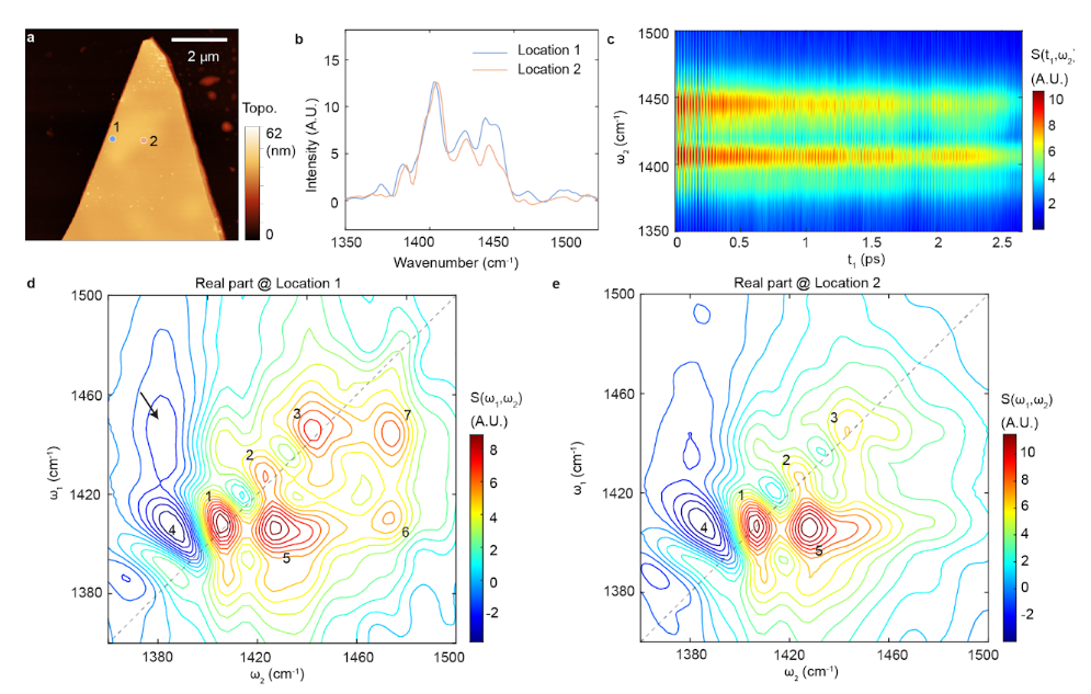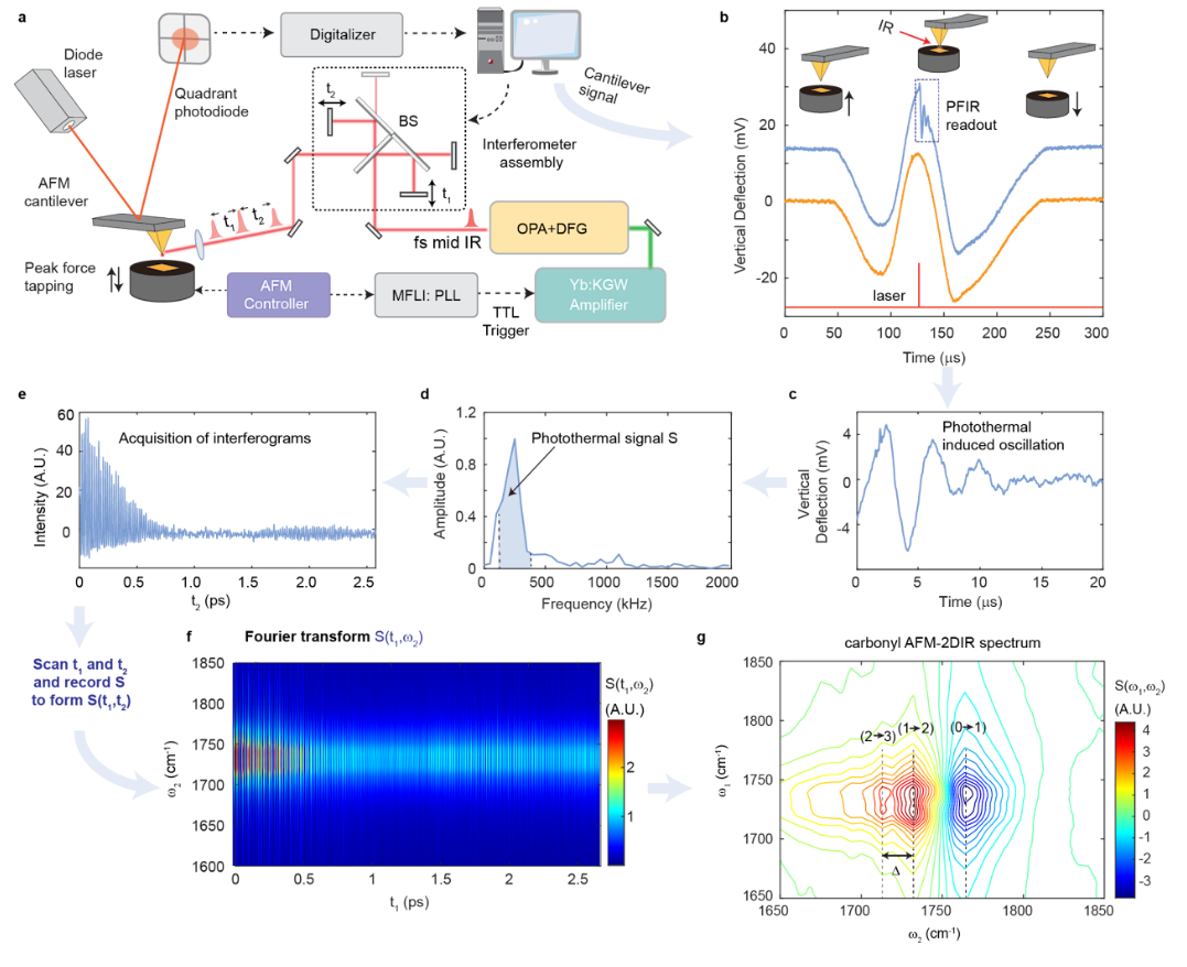 Meanwhile, the development of time-domain two-dimensional IR (2DIR) techniques, which involves the sequential emission of precisely timed femtosecond IR pulses, has provided intricate spectroscopic information on molecular interactions, such as anharmonicities and coupling of vibrational modes of molecules and energy transfer. However, the spatial resolution of 2DIR is usually restricted by Abbe's diffraction limit. Merging the tip-enhancement of AFM with 2DIR could enable Abbe's diffraction limit to be surpassed, allowing for nanoscale spatial resolution, while also offering the rich spectroscopic information like that of 2DIR spectroscopy.