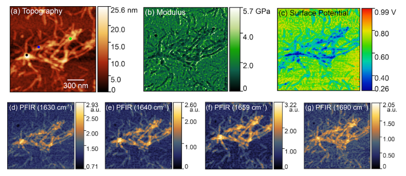Another application of the PFIR-KPFM is on amyloid fibrils. Both surface potential and IR signals are collected. Surface potential reveals the presence of local charges; an IR signal is indicative of the secondary structures.