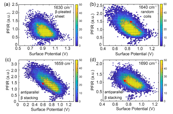 The correlative analysis reveals the surface potential signal with the anti-parallel beta stacking. PFIR-KPFM measurement on FapC fibrils shows a strong correlation of surface potential with antiparallel beta stacking.