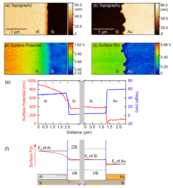 Between Si and Au, a clear barrier is observed in the surface potential, it is a manifestation of the Schottky barrier. The high spatial resolution of the PF-KPFM allows the study of these two types of barriers at a 10 nm scale under ambient conditions. For more details, please see our paper ACS Nano, 14, 4, 4839 (2020).