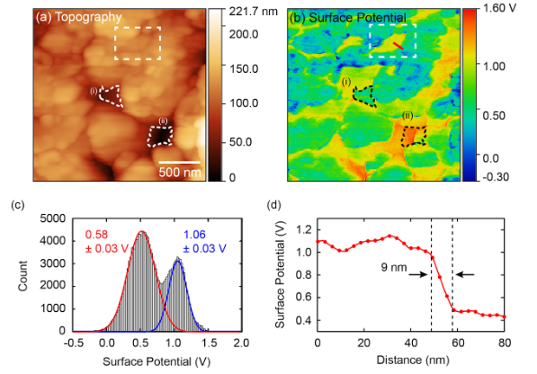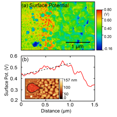 PF-KPFM is also useful to observe the presence of surface charge distributions. The figure shows a surface potential map of a MAPbBr₃ crystal surface with PbBr₂ degradation. Accumulation of charge appears at the MAPbBr₃ side close to the PbBr₂.