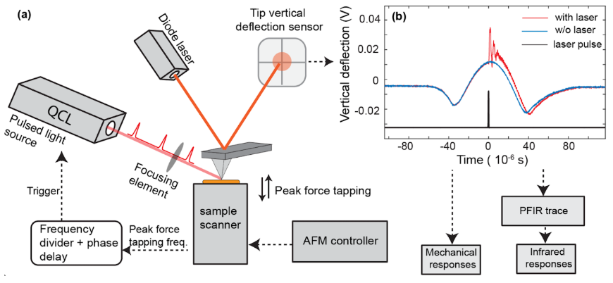 One main limitation of the regular PFIR microscopy is its relatively weak signal. The peak force tapping cycle of an AFM is usually a few kHz (1kHz up to 8 kHz), which means that the tip and sample are in contact a few thousand times per second. At each tip-sample contact, a laser pulse is emitted to excite the photothermal expansion of the sample, and the cantilever responses are extracted to be used as a signal.