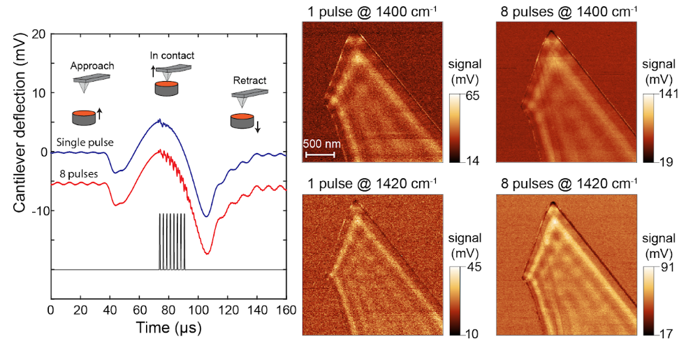 The implementation of the multi-pulse PFIR is to illuminate multiple laser pulses per peak force tapping cycle. So more photothermal responses are generated per unit time. The resulting method improves the signal quality of PFIR microscopy.