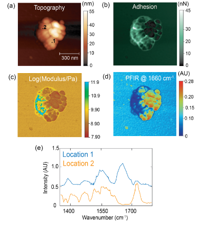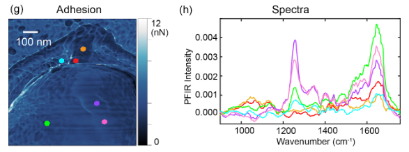 The PFIR microscopy has another intrinsic advantage inherited from the peak force tapping mode. Under weak IR illumination, the mechanical properties of modulus and adhesion are simultaneously collected with the IR images, without separate scans. As the peak force tapping mode works well in the fluid, the PFIR microscopy also works in the fluid phase, including water.