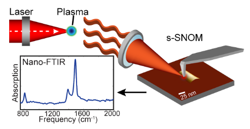 s-SNOM detects the linearly scattered light. The bandwidth of the light source determines the frequency that s-SNOM can operate. Current broadband infrared lasers from the difference frequency generation (DFG) of ultrafast lasers are expensive and bandwidth-limited.